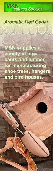 M&N supplies fine quality Eastern Aromatic Red Cedar logs, cants and lumber for manufacturing shoe trees, hangers, shake roofing, and bird houses. Cedar's natural beauty and durability makes it a perfect material or many uses. Contact us for further information of how we can fufill your Red Cedar needs. |
